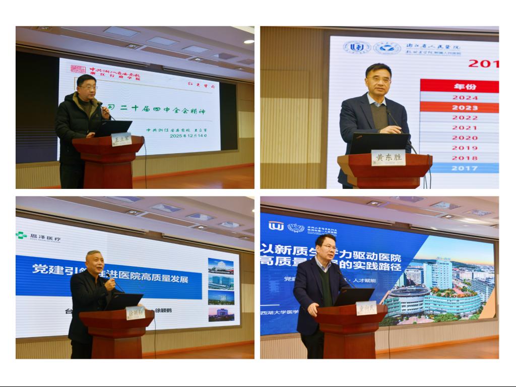 杭州市第一人民医院党委书记童向民出席开班仪式并致辞。本次党务干部培训,聚焦学习贯彻党的二十届四中全会精神,围绕党建引领下医院和学院的高质量发展主题,通过党课宣讲、分组研讨、实践学习等组织开展。浙江发展战略研究院副院长王立军教授,杭州医学院原校长、中国医院协会省级区院分会名誉主任委员黄东胜教授,台州恩泽医疗中心党工委书记徐颖鹤教授分别围绕“党的二十届四中全会精神”“高质量发展视野下的学科建设路径”和“党建引领医院高质量发展”等专题,为全体学员带来三场精彩的党课。